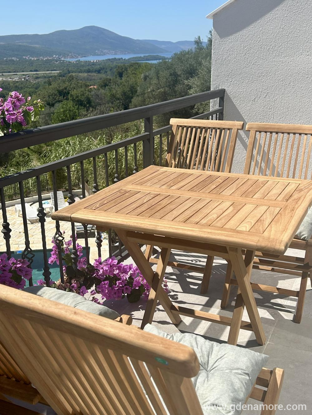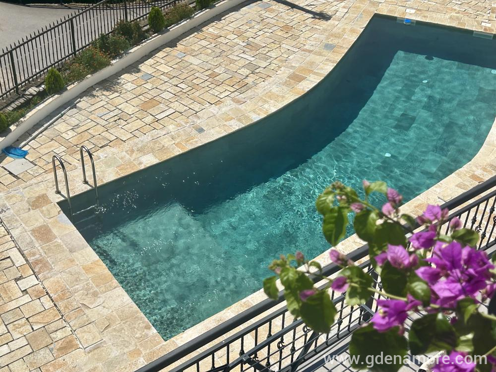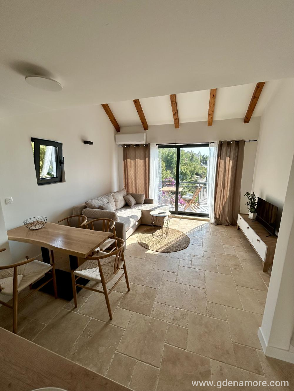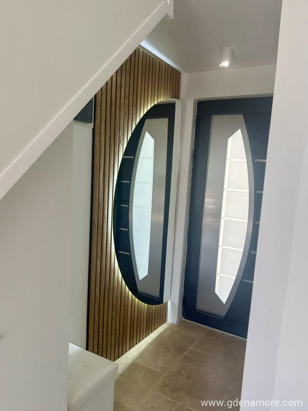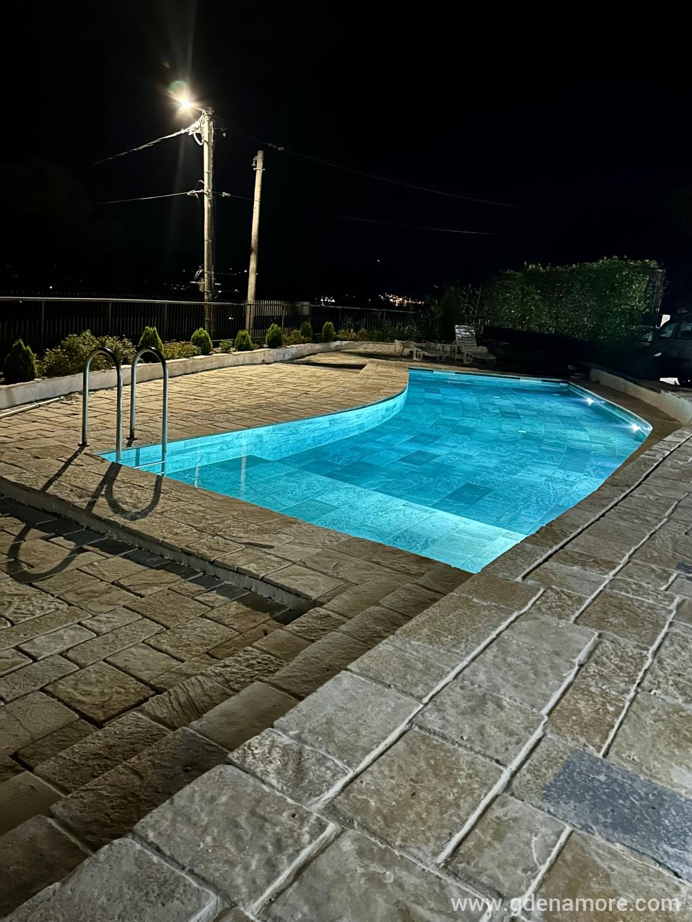Kuca se izdaje sa tri apartmana,privatnim parkingom,bazenom,dvoristem i pogledom na more.Kuca se nalazi na drugoj strani izlaza iz tunela prema Tivtu,nalazi se u mirnom dijelu u blizini plaza na svega 10minuta voznje udaljeni ste od Tivta i Kotora sto predstavlja dobru povezanost i blizinu velikih trgovackih lanaca.U dvoristu kuce se i nalazi izvor pitke vode i nalazi se u mirnom djelu grada.
