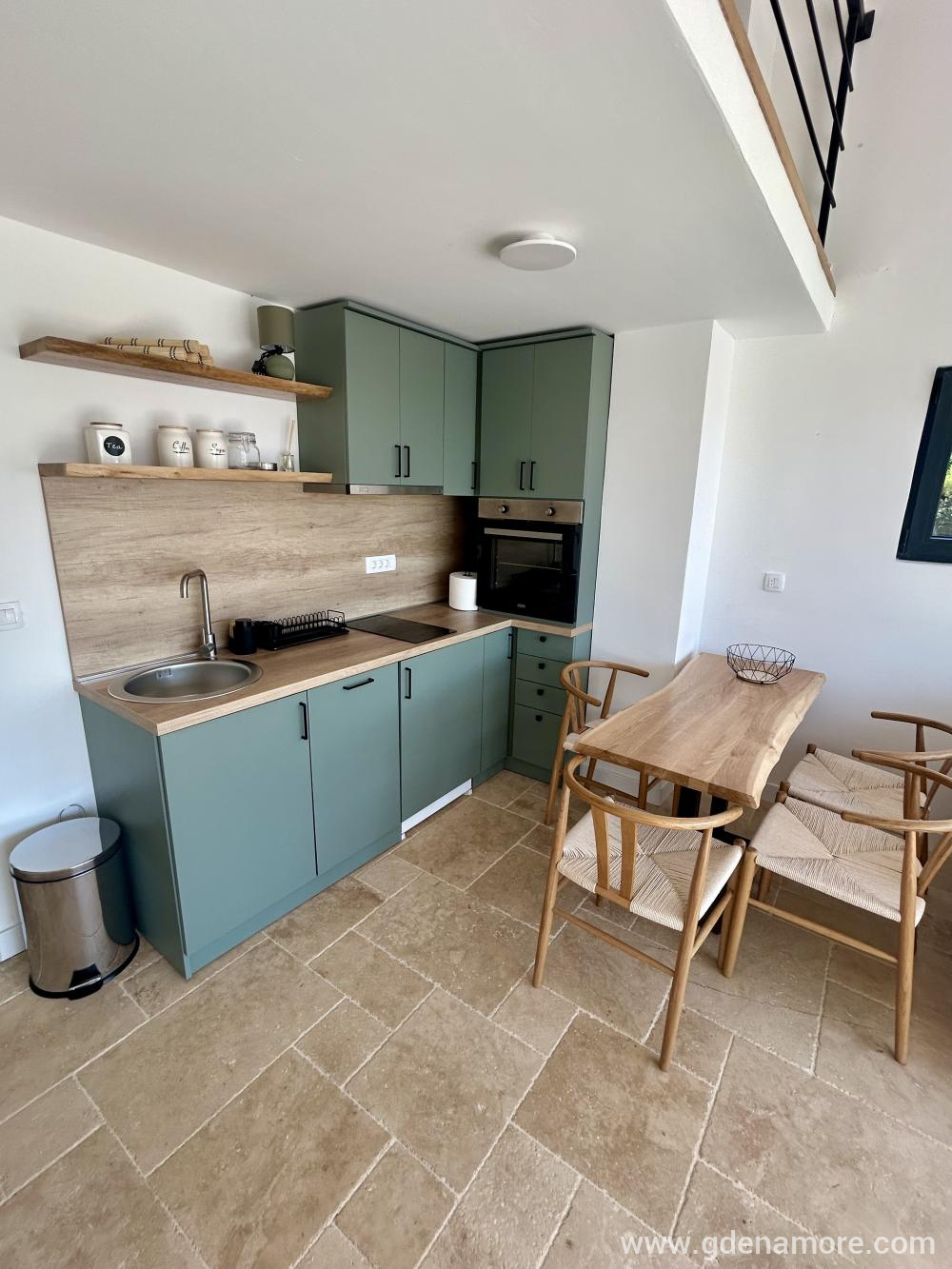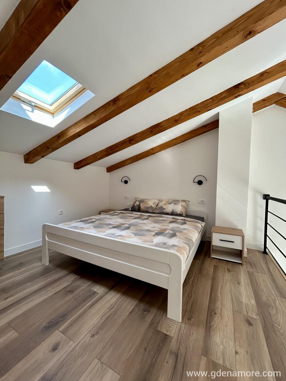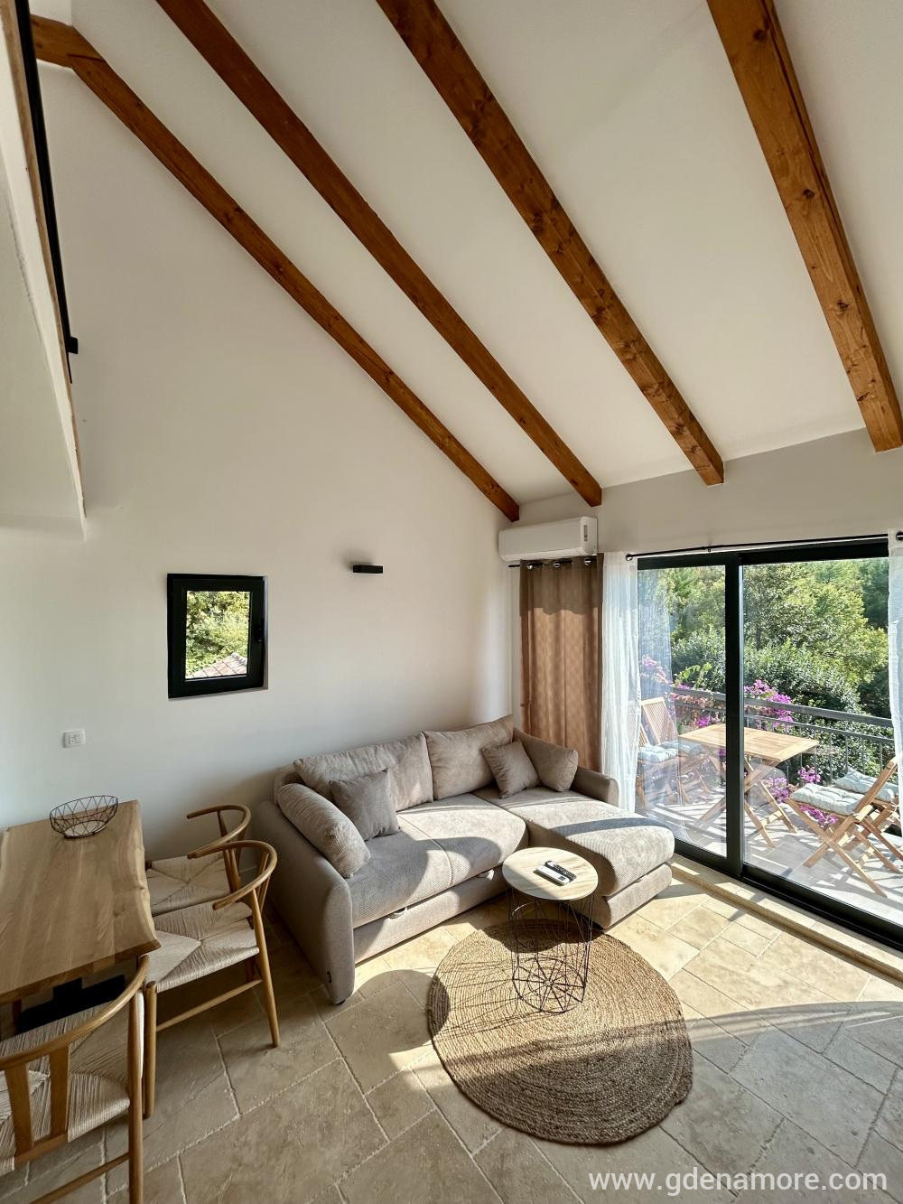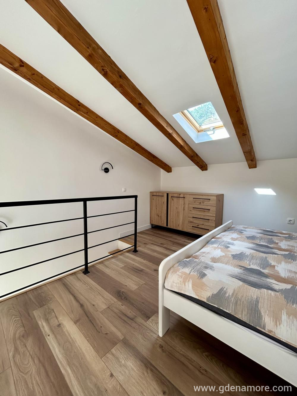 Kuca se izdaje sa tri apartmana,privatnim parkingom,bazenom,dvoristem i pogledom na more.Kuca se nalazi na drugoj strani izlaza iz tunela prema Tivtu,nalazi se u mirnom dijelu u blizini plaza na svega 10minuta voznje udaljeni ste od Tivta i Kotora sto predstavlja dobru povezanost i blizinu velikih trgovackih lanaca.U dvoristu kuce se i nalazi izvor pitke vode i nalazi se u mirnom djelu grada.