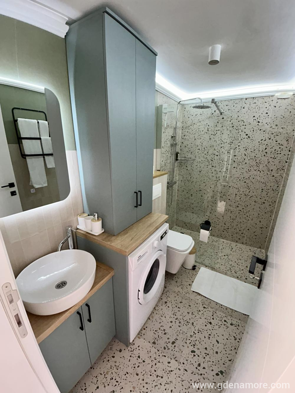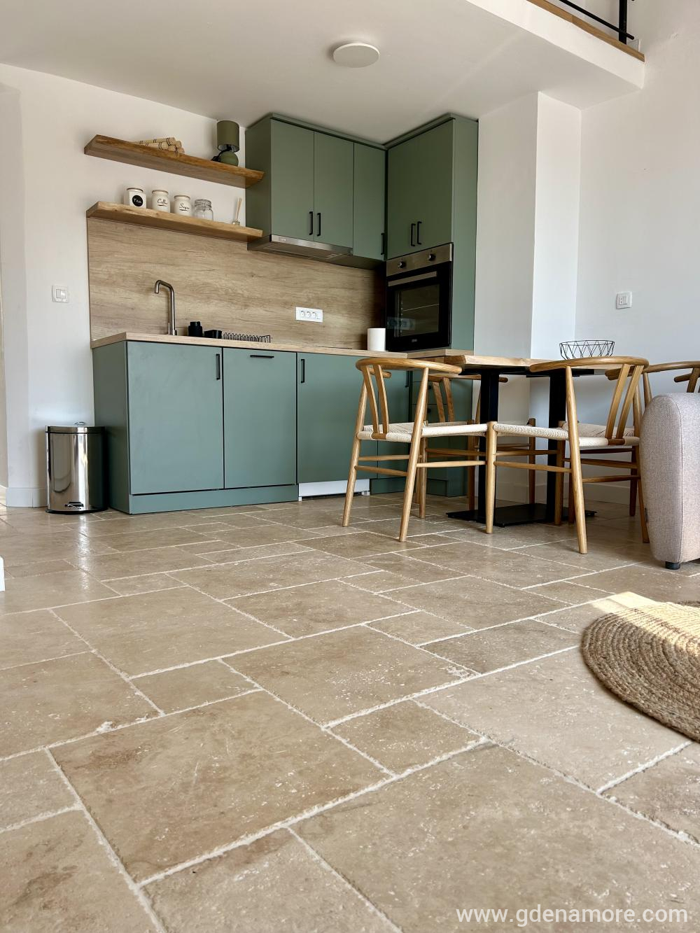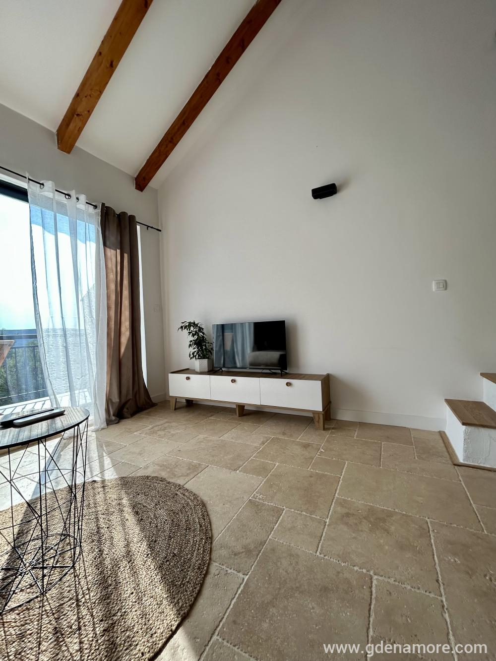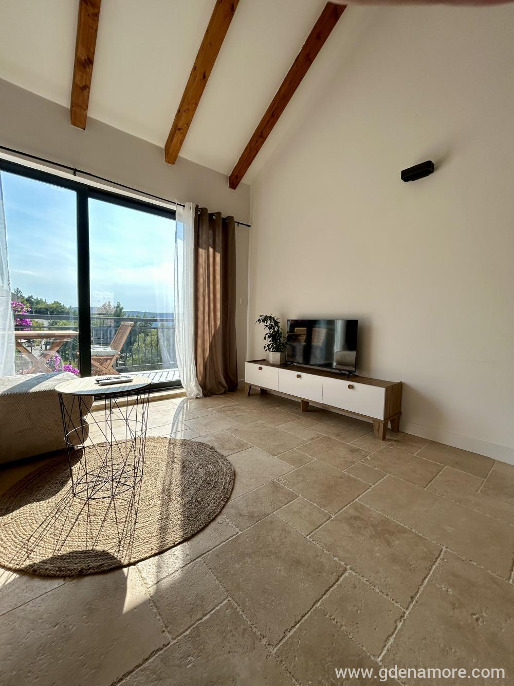Kuca se izdaje sa tri apartmana,privatnim parkingom,bazenom,dvoristem i pogledom na more.Kuca se nalazi na drugoj strani izlaza iz tunela prema Tivtu,nalazi se u mirnom dijelu u blizini plaza na svega 10minuta voznje udaljeni ste od Tivta i Kotora sto predstavlja dobru povezanost i blizinu velikih trgovackih lanaca.U dvoristu kuce se i nalazi izvor pitke vode i nalazi se u mirnom djelu grada.